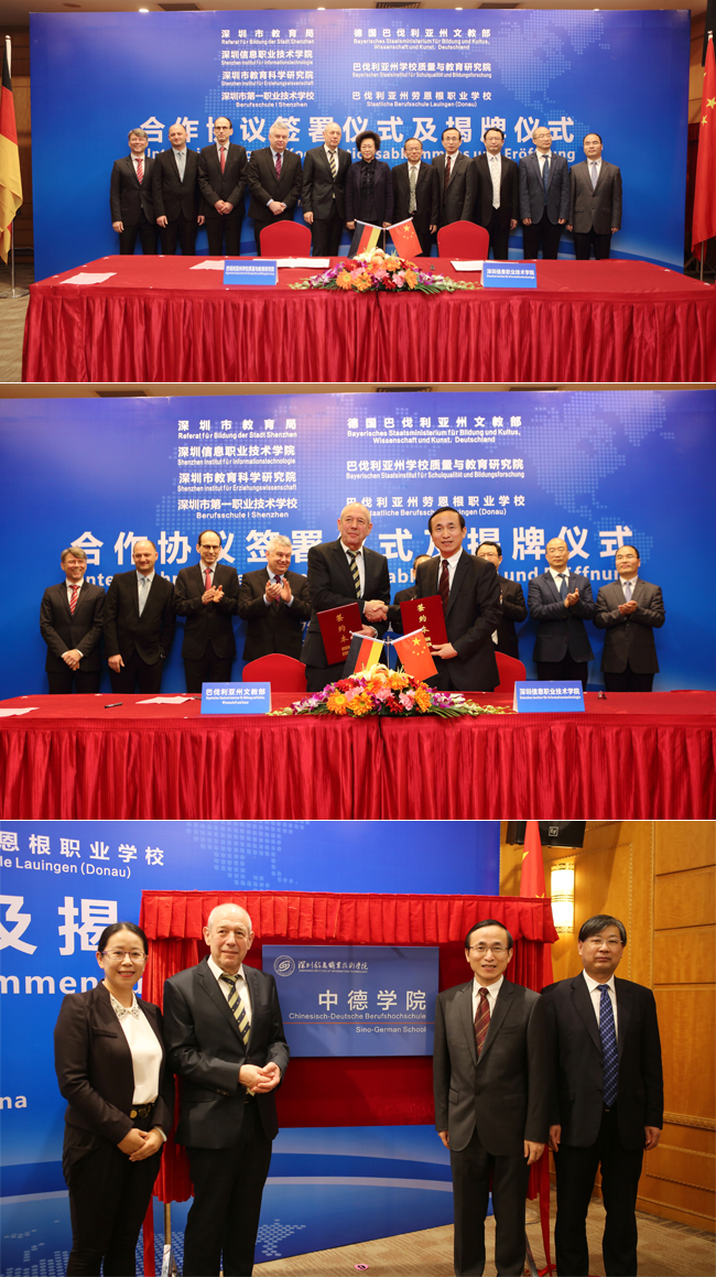 德国具有全球一流的“双元制”职业教育体系,也是我校职业教育学习的标杆。根据深圳市教育局和德国巴伐利亚州文教部于2016年9月签署的《职业教育合作备忘录》,决定在我校开展德国职业教育合作办学项目,筹建“中德学院”,引进德国“双元制”职业教育标准,开创“高等职业技术教育”新模式,培养我市亟需的国际化专业化技能人才。
