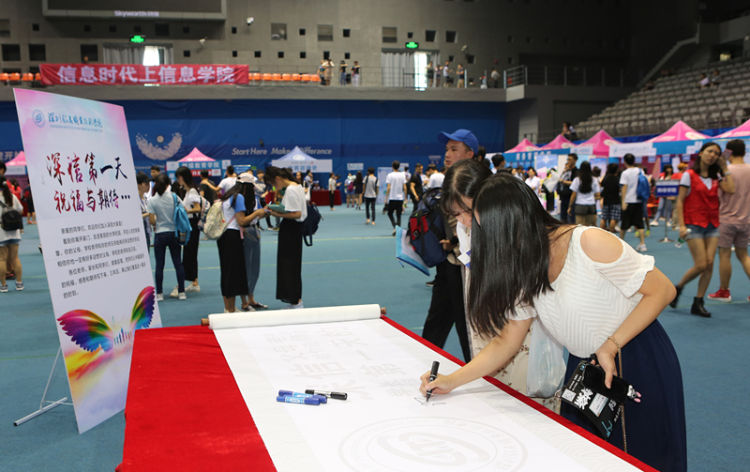 16日上午,记者在信息学院的大运村校园看到,迎新气氛热烈,秩序井然。新生报到处设在体育馆,不少新生在“深信第一天”留言台兴奋地写下对大学生活的祝福与期待。到现场看望新生和工作人员的孙湧校长也留言勉励同学们:“自信,执着,勇往直前。”